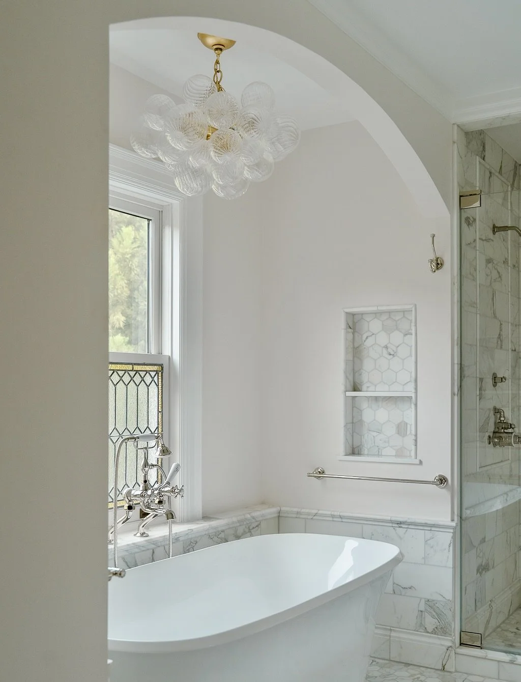 The program for this project involved the reimagining and renovation of the second floor, including the bathrooms, dressing room, and laundry area. The design combined the existing primary bathroom with an adjacent dressing room to create a deep, private oasis for my clients, including a separate toilet, a tub area, a large walk-in shower, and a separate vanity for makeup. The custom cabinetry and classic stone choices created a progression of spa-like spaces, so the clients can begin and end their day relaxed. An existing hall bathroom was converted to a laundry room, and the adjacent dressing room was transformed into an ensuite children's bathroom with large floor-to-ceiling closets for much-needed storage. The renovation also included an ensuite bathroom for the guest room and a renovation of the existing primary dressing area.